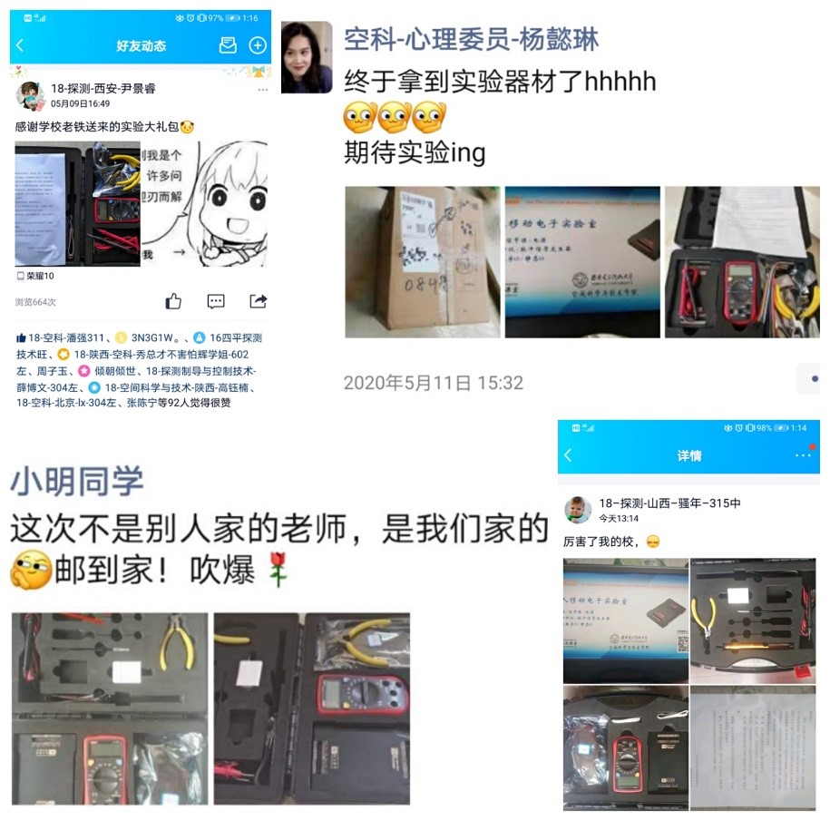 从孙文方老师、高建宁老师对线上教学方案的推敲设计、反复规划,到程春霞老师、沈利荣老师不厌其烦地讨论测试并整理线上实验授课平台操作指南;从杨涛老师、王斌老师对每一件便携设备和器材进行初始化设置和性能测试,到苏博老师协助快递公司精心分装打包寄出……为确保邮寄给员工的实验设备、器件性能完好,4月27日起,学院实验中心的全体老师对近100份“个人移动实验室”进行配置,将实验设备器材包邮寄送到身处祖国新疆、青海、海南、广西、广东、黑龙江等大江南北、各个省市的每一位员工手中,真正实现了“实验到家”。