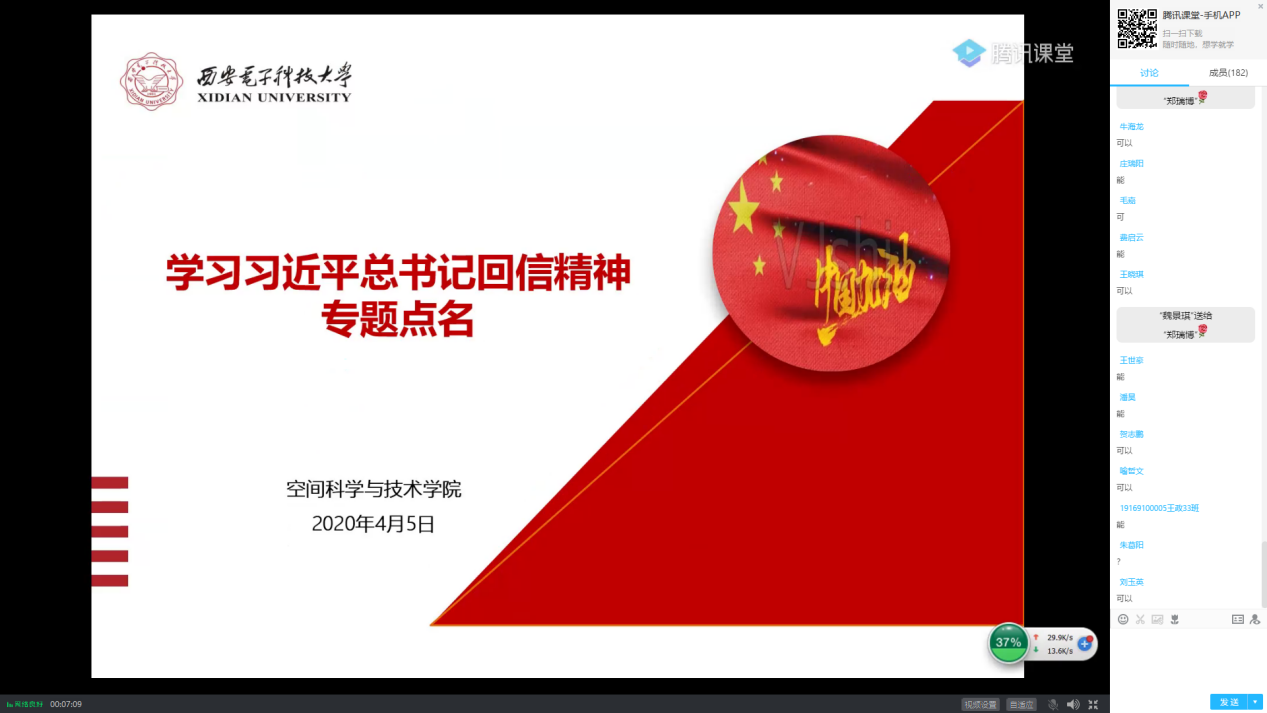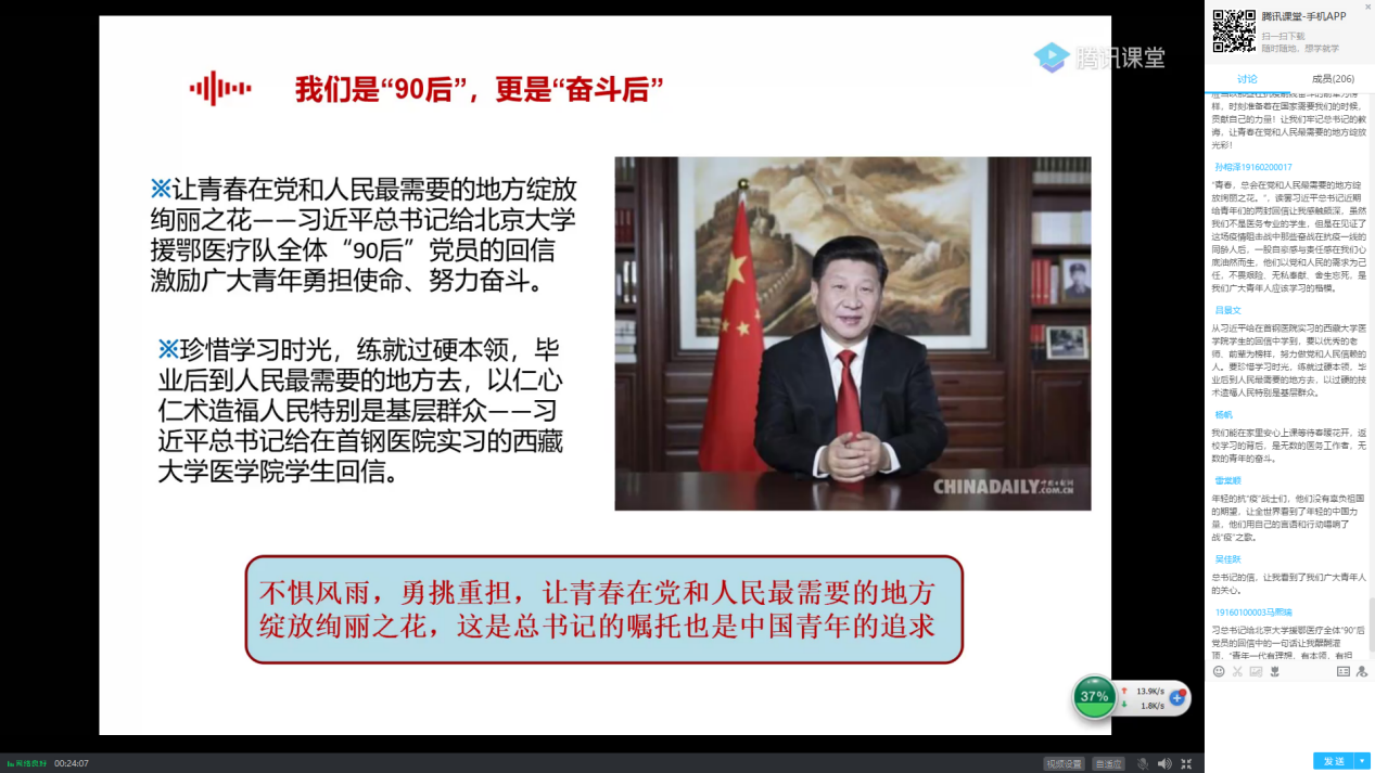 “新时代中国青年在此次疫情防控阻击战中勇于担当、甘于奉献,展现了青年人该有的朝气蓬勃和青春力量,习近平总书记的两封回信,不仅是对我们当代青年的充分肯定,更是对我们的殷切期望,希望同学们能够充分领会总书记的回信精神并转化到日常行动中,只争朝夕,不负韶华,珍惜本科四年的大好时光,锻炼意志品质,加强理论学习,提高实践能力,让青春在奋斗中绽放光彩”,辅导员郑瑞博利用腾讯课堂平台面向学院2017级、2019级全体员工开展了专题点名,带领员工深入学习习近平总书记近期两封回信精神,并组织员工开展线上大讨论,借助课堂发言功能与员工讨论交流学习感悟,进一步加深员工对于回信精神的思考和理解。
