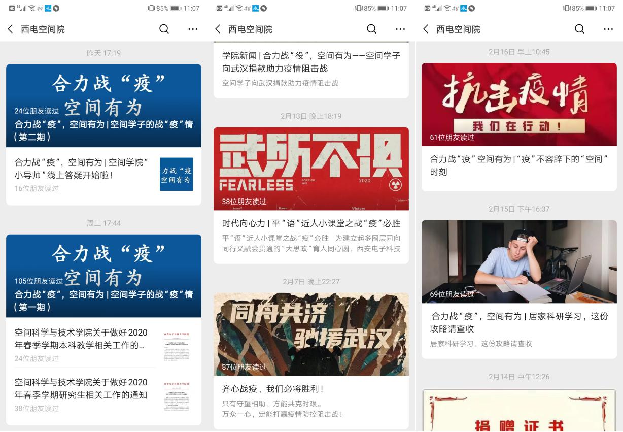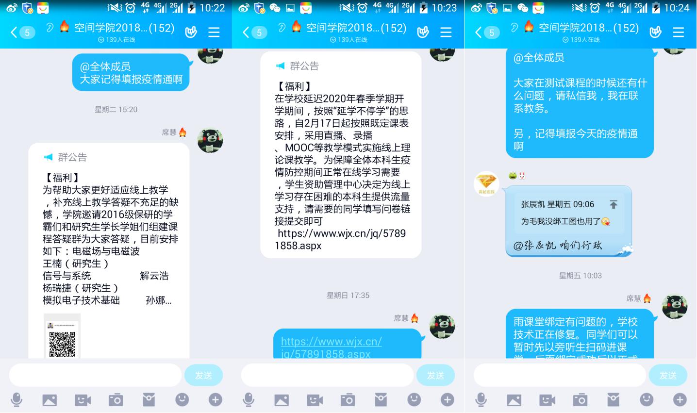 “线上点名”结束后,同学们纷纷表示在疫情防控的特殊时期,应当更加坚定信念增强信心,严格遵守学校的各项要求,众志成城同心战“疫”。学院2016级员工万名尧说道:“老师们对我的关怀无微不至,对此我十分的感激。对于这次疫情,我一定会做好自己的本分,认真防护,在家期间努力提高自己,争取在疫情结束时对学校,对自己交出一份满意的答卷。”学院2019级员工桂宇哲表示:“隔离病毒绝不隔离爱,学院领导、老师们的慰问如同冬日暖阳温暖着我们的心,如今线上学习已经开始,我们会以饱满的热情和积极的态度面对新学期的学习,同时注意身体健康,配合当地政府,为对抗疫情贡献出属于自己的一份力量,也期待春暖花开之时能和大家再次相遇在美丽的西电校园中。”