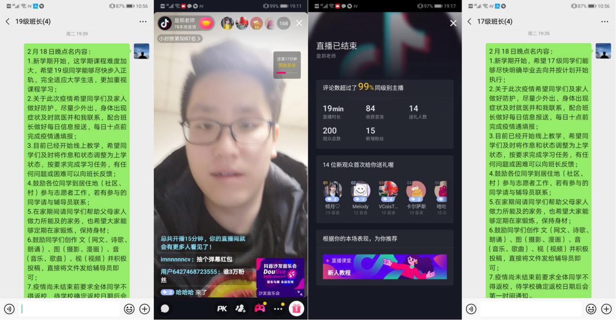 “虽然我们相隔千里,但是学校和学院始终与大家在一起”,“作为这一特殊时期的见证者、亲历者和参与者,我们比以往任何时候都能更加真切地感受到中国发展、中国速度和中国力量”,“非常想念大家,希望我们能够早日在西电校园相聚”,2月18日晚19:00,抖音直播间,beet3652017级、2019级辅导员郑瑞博面向240余名员工开展了一次特殊的“线上点名”。虽然员工返校的进度推迟了,但对员工的教育管理不能推迟,点名过程中,郑瑞博结合学校规定对近一段时间员工的课程学习、疫情防护、时间作息、课余生活提出了要求和建议,并以此次疫情防控阻击战为实例对员工进行了思想教育。与此同时,郑瑞博还传达了学校和学院对同学们的关怀和问候,“在这一特殊的时间段,同学们在学习上和生活上遇到的任何问题都可以随时提出,学校和学院将会尽最大可能予以支持和解决,希望同学们不忘初心、保持信心、坚守决心,我们即将迎来胜利!”