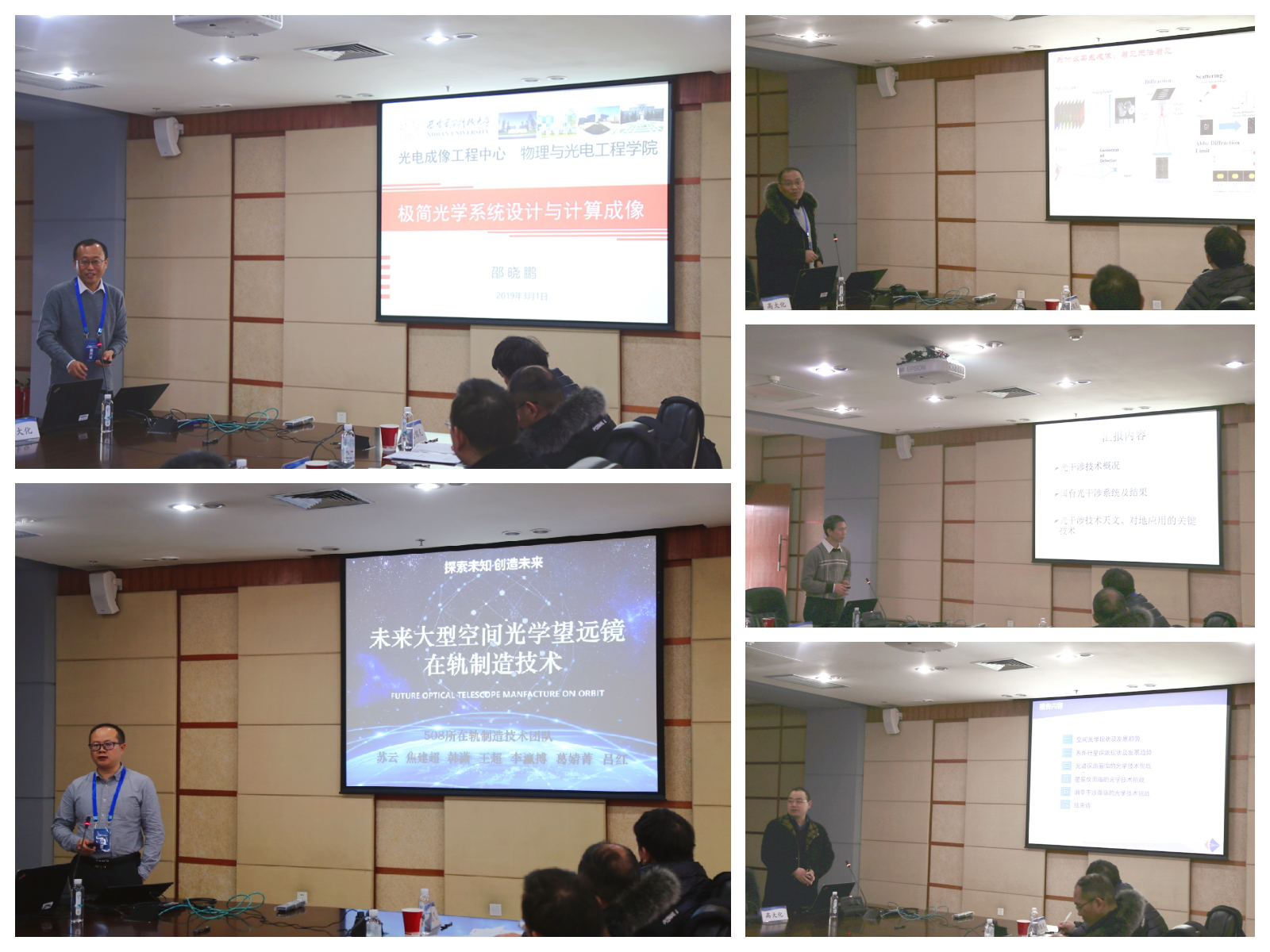 中国科学院国家天文台姜爱民研究员、北京空间机电研究所苏云研究员、中国科学院西安光机所樊学武研究员、上海光机所韩申生研究员、beet365邵晓鹏教授为广大师生带来“基于望远镜阵列的光学综合孔径技术”、“未来大型空间光学望远镜在轨制造技术”、“系外行星探测面临的光学技术挑战”、“看见无法看见—鬼成像研究进展”、“极简光学系统设计与计算成像”5场精彩的学术报告,围绕空间光学合成孔径领域最新研究成果开展深度研讨和交流。