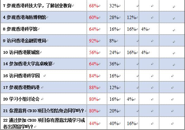 员工对CDIO项目中各个活动的满意度评价很高。对于项目中安排的《互联网+时代初创体验》课程和访问香港金融管理局的活动满意度最高。满意度次之的是《电子商务》课程、参观香港大学校园和参观香港数码港的项目。员工对于科技前沿的内容比较感兴趣,满意度也较高。但仍有部分项目工作需要改善。部分员工建议学校要多开展此类交流活动,设立相关奖学金,积极鼓励员工出国访学、游学。并且活动不应该仅仅局限在亚洲,要有全球视野。目前学校对此类对外交流活动大力支持,凡参与此活动的同学均能获得了资助奖励。