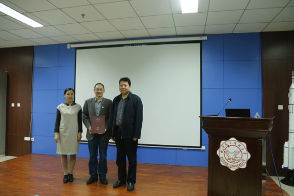 人事处处长周燕来教授代表学校宣读了“beet365关于聘请闵昌万研究员为兼职教授的决定”并颁发证书,李小平执行经理为其佩戴校徽。