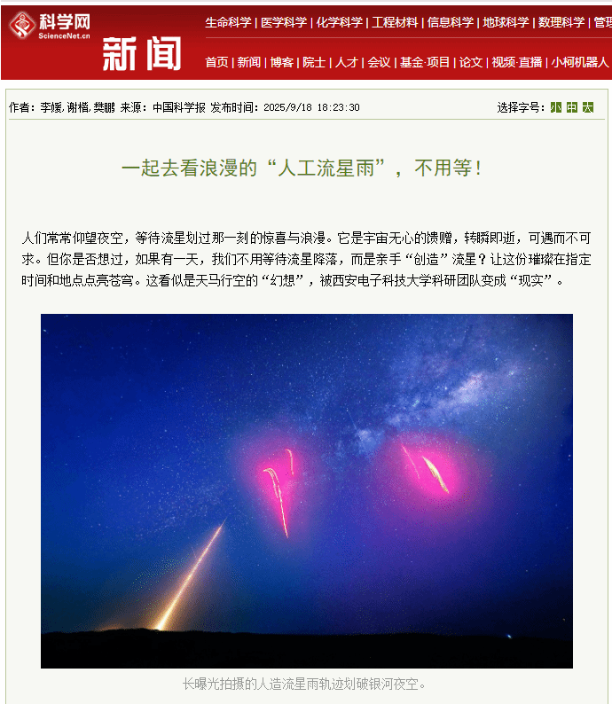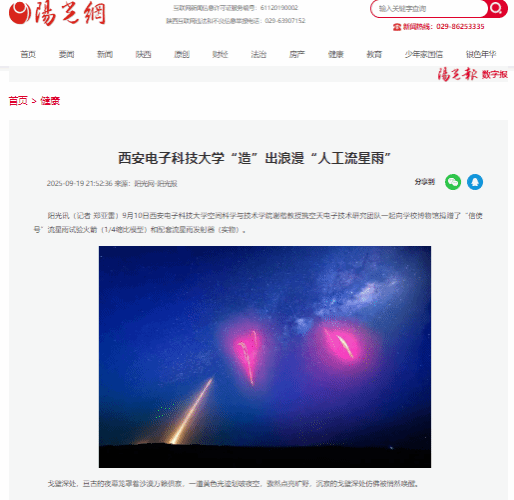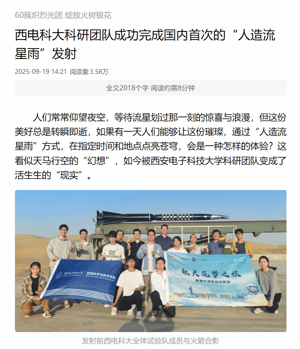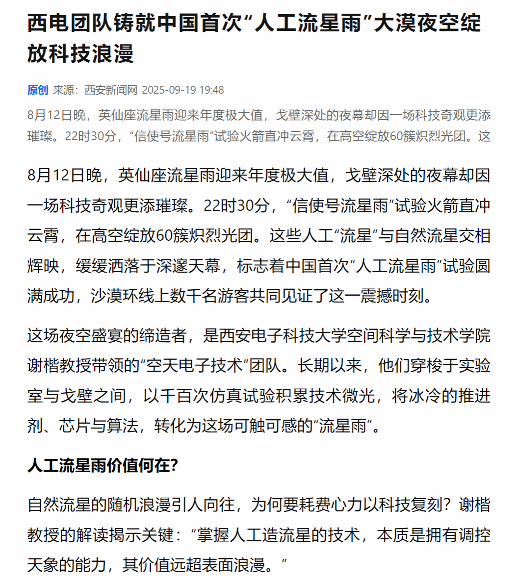 戈壁深处亘古的夜幕笼罩着沙漠万籁俱寂一道黄色光迹划破夜空骤然点亮旷野沉寂的戈壁深处仿佛被悄然唤醒2025年8月12日晚一年一度的英仙座流星雨迎来极大值今年在这片亘古夜幕中还多了另一抹璀璨当晚22时30分一枚名为“信使号流星雨”的试验火箭发出低沉轰鸣腾空而起经历数十秒的穿云破雾它冲出大气在沙漠天幕之巅骤然绽放六十簇炽烈光团宛若火树银花倾泻而下与自然流星交相辉映缓缓洒落于深邃的天幕之中沙漠环线上在数千名沿途游客的共同见证下这场全国首次的“人工流星雨”试验圆满成功科技绽放出的璀璨光芒温柔点亮万里苍穹将理性的精密与感性的浪漫融于同一片夜空这片绚烂光芒的制造者就是beet365beet365谢楷教授和他带领的“空天电子技术”团队——一支以苍穹为卷、以星火为墨的“造梦者”沙漠环线上在数千名沿途游客的共同见证下这场全国首次的“人工流星雨”试验圆满成功科技绽放出的璀璨光芒温柔点亮万里苍穹将理性的精密与感性的浪漫融于同一片夜空这片绚烂光芒的制造者就是beet365beet365谢楷教授和他带领的“空天电子技术”团队——一支以苍穹为卷、以星火为墨的“造梦者”2025年9月10日beet365beet365谢楷教授携空天电子技术研究团队一起向学校博物馆捐赠了“信使号”流星雨试验火箭(1/4缩比模型)和配套流星雨发射器(实物)这件特殊的捐赠品后面有什么特殊的故事自然流星的璀璨向来“可遇不可求”但谢楷教授团队用科技将这份浪漫变为了“可掌控的奇迹”这也引发了校外媒体广泛关注从科学原理解读到技术突破剖析各类报道带公众走进这场“夜空盛宴”让我们看看他们怎么说