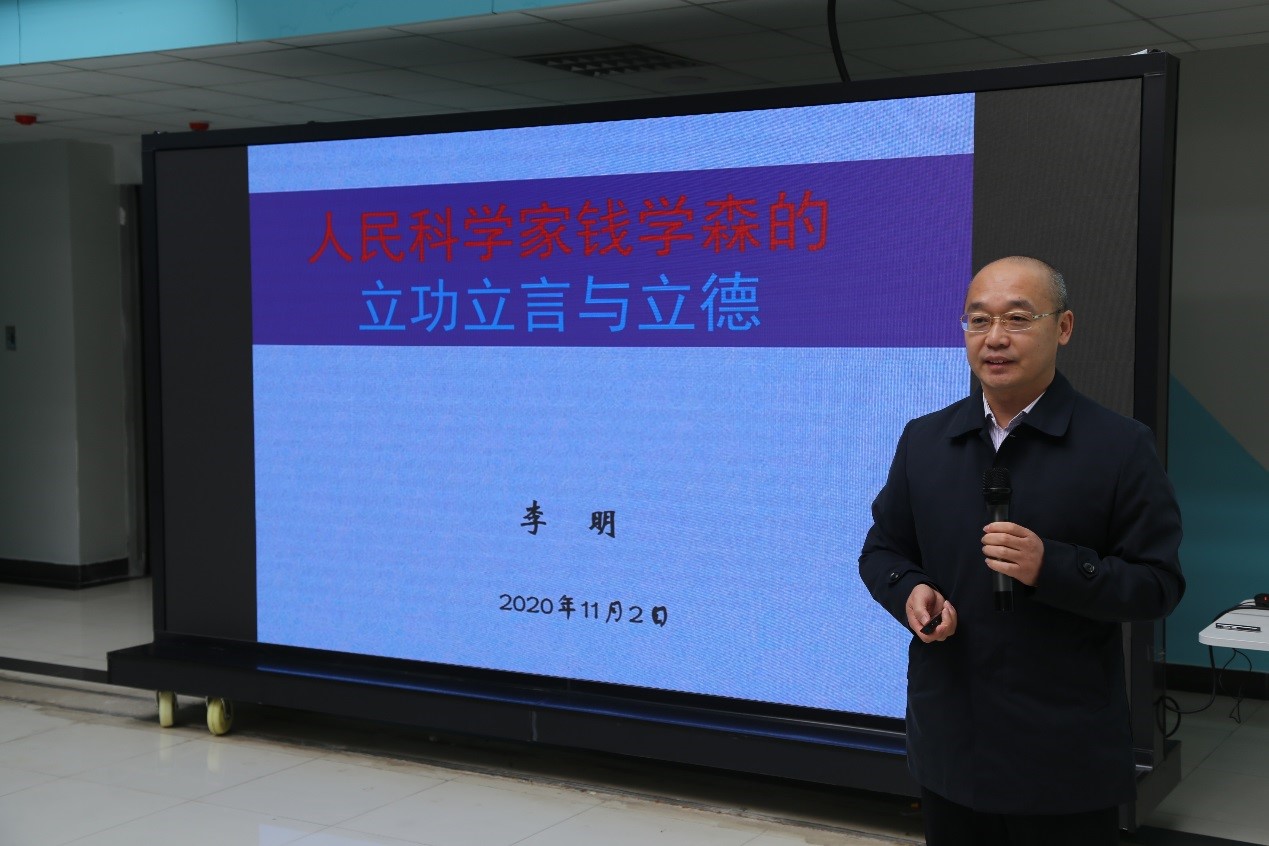 “中国古代将‘立德、立言、立功’视为人生‘三不朽’,宋代大儒张载认为读书人的最高目标是‘为天地立心,为生民立命,为往圣继绝学,为万世开太平’”,李明先生引经据典,以中华优秀传统文化开篇引出钱学森的传奇人生。在报告中他通过“志存高远、奋发学习”“矢志科学、胸怀祖国”“筚路蓝缕、艰苦创业”三部分深入浅出地介绍了钱学森的治学精神、报国情怀和科学事业。与此同时,他以立功、立言与立德三个层次详细分析了钱学森为我国科技发展、国防建设和航天事业做出的卓越贡献以及不为富贵功名、超凡脱俗的品德风范。李明表示,五年归国路,十年两弹成,钱学森院士这样一位为中华民族崛起立功、立言、立德“三不朽”的人民科学家,他的人生经历将永远激励我们不畏艰险、勇攀高峰,在中华民族从站起来富起来到强起来的伟大实践中接续奋斗。