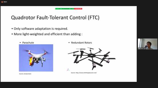 孙思昊研究员以“多旋翼无人机容错控制”为主题,介绍了多旋翼无人机(四轴无人机)在单个旋翼完全失效下的容错控制。孙思昊研究员结合自身科研工作,介绍了旋翼无人机在单发失效下基本的悬停控制、旋翼失效情况下提高抗扰动性能的措施、大初始扰动下旋翼无人机姿态恢复控制以及基于视觉导航的旋翼无人机容错控制方案。