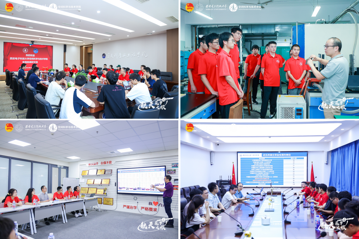 高校作为人才培养的主阵地,肩负着为党育人、为国育才的重大使命。实践团在设计此次实践活动方案之初,便将高校调研交流作为一项重要环节,对接了西安交通大学航天航空学院、西北工业大学航天学院、四川大学空天科学与工程学院以及西南交通大学力学与航空航天学院四所双一流大学的航天领域院系开展走访调研。在西安交通大学和西北工业大学,实践队员参观了科研实验室、工程研究装置以及教学科研平台,并与现场师生就科研方向、技术特点、研究进展以及应用场景进行了细致探讨。在四川大学江安校区,实践队员结合个人学习研究方向与川大师生展开深入交流,与此同时,队员们共同策划了一场别开生面的“初心分享会”,畅谈个人在实践行程中的所见所闻与收获体会,实践队员、学院研究生会骨干智斌亮表示,“我所在课题组的研究课题之一就是飞行器编队飞行控制,我希望能够在老师的指导下继续深耕这一领域,为我国科技事业发展贡献自己的一份力。”在西南交通大学,实践队员们聆听了由力学与航空航天公司党委副书记孔祥彬主讲的专题团课“用‘习语金句’觉解绚丽青春——从就业与职业发展角度”,一堂有思想高度、有理论深度、有关怀温度的交互式思政课有效帮助队员们确立了个人成长与事业发展的准确航向。
