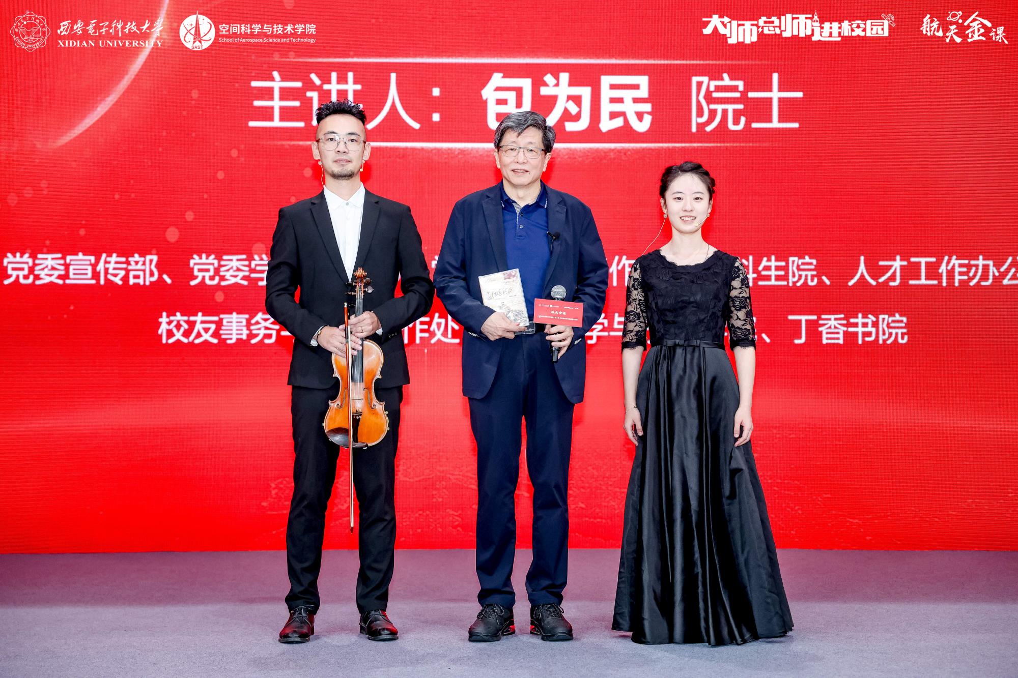 时值学校92周年校庆,员工代表在课程结束后也为包为民“学长”送上了情谊满满的礼物,在悠扬的小提琴演奏曲中,学校老员工交响乐团的本科生王欣禾和博士生李祯煜为包为民院士献上了西电首部校园文化精品《长征组歌》首演实况光盘,向作为曾经小提琴社一员的包为民院士发起了“科学与艺术”合奏之约。包为民院士回忆到:“当时我是班里的文体委员,喜欢丰富大家的业余生活,刻苦学习的同时,劳逸结合也是非常重要的。”