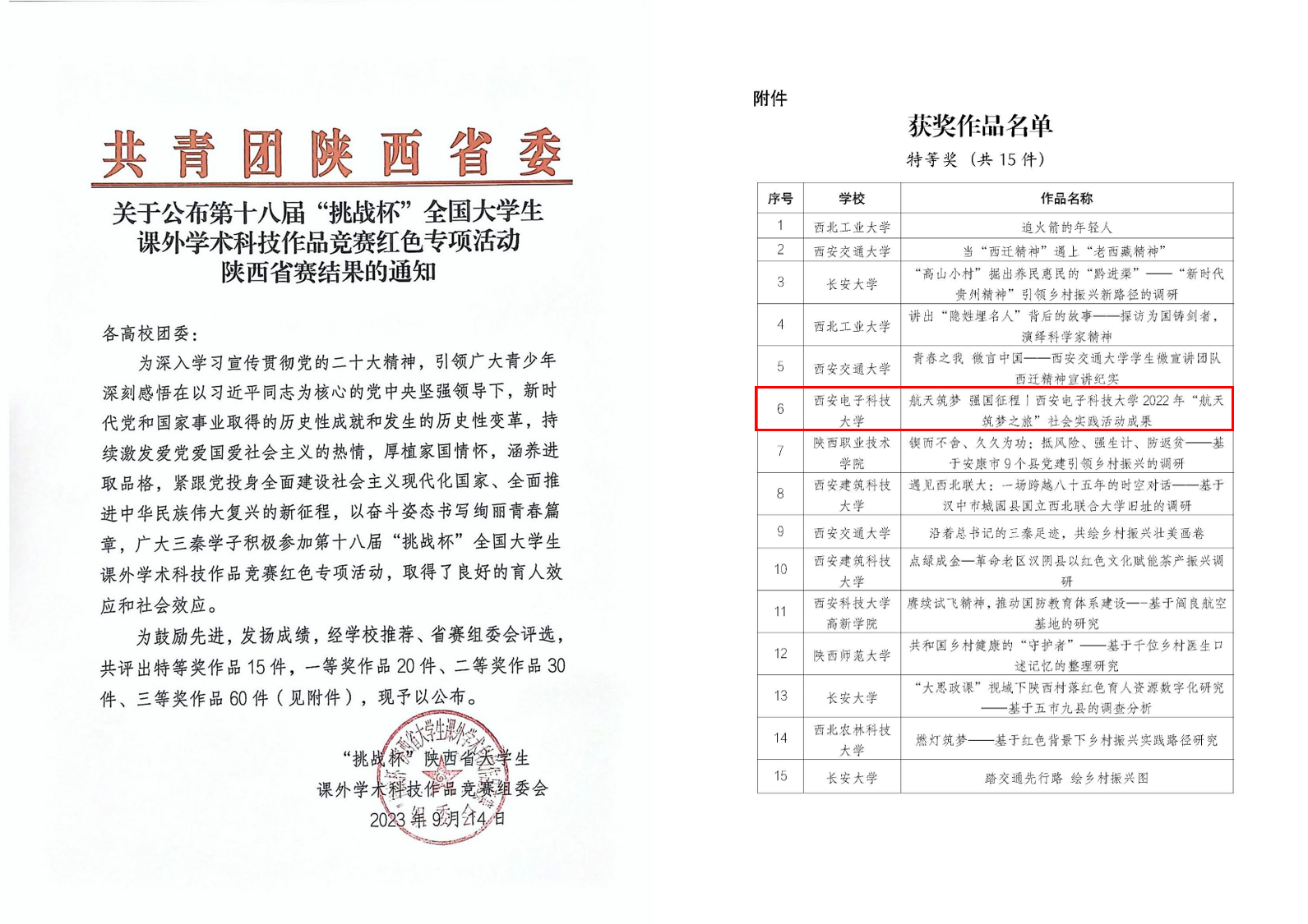 (通讯员 郑瑞博 李小军)近日,第十八届“挑战杯”全国老员工课外学术科技作品竞赛红色专项活动陕西省赛落下帷幕,beet365申报的《航天筑梦 强国征程丨beet3652022年“航天筑梦之旅”社会实践活动成果》斩获特等奖。
