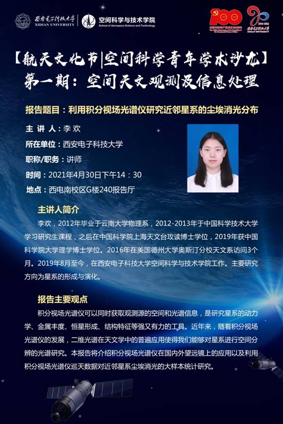为促进空间科学与技术领域青年教师优秀科研成果的交流分享,拓展青年教师的学术视野,搭建空间科学与技术领域教师学术交流平台,以航天文化节为契机,举办 “空间科学青年学术沙龙”系列活动。