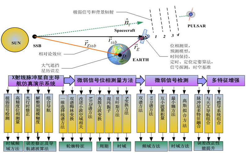 X射线脉冲星导航具有优越的定时、定位和定姿功能,是十分有前途的航天器自主导航定位解决方案,近几年已成为国内、国际研究的热点。从2002年开始,我们在1项国家863、3项国家自然科学基金和2项跨行业基金等项目支撑下,建立了X射线脉冲星导航地面演示系统,为导航信号的获取、信号处理、时间同步和导航设计验证提供完整的仿真实验平台。提出了X射线脉冲星微弱信号位相测量的时域、频域方法,以及X射线脉冲星微弱信号检测的三类方法;设计实现了多种适用于脉冲星导航的非线性导航算法及多系统组合导航方法。