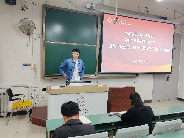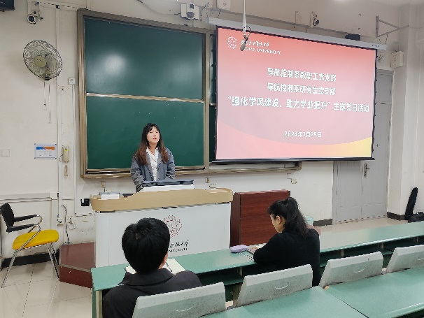 随后,导航控制系教职工党支部书记戴浩老师对探测制导与控制技术专业的现状进行了深入剖析。他简要分析了各年级员工的学习状况,着重强调了本科阶段学习的重要性和当前学业提升的紧迫性,并向大家详细介绍了学院为提升本科生学业水平所采取的一系列举措,重点向大家介绍了“探测专业员工学业提升计划”,该计划拟通过建立学业互助小组,从学业规划、科研引导、就业指导、心理疏导等方面开展工作,根据员工个性化需要,优化学业帮扶结构,开展英语打卡、高数学业辅导等活动,补短板强弱项,促进本科生学业水平的整体提升。