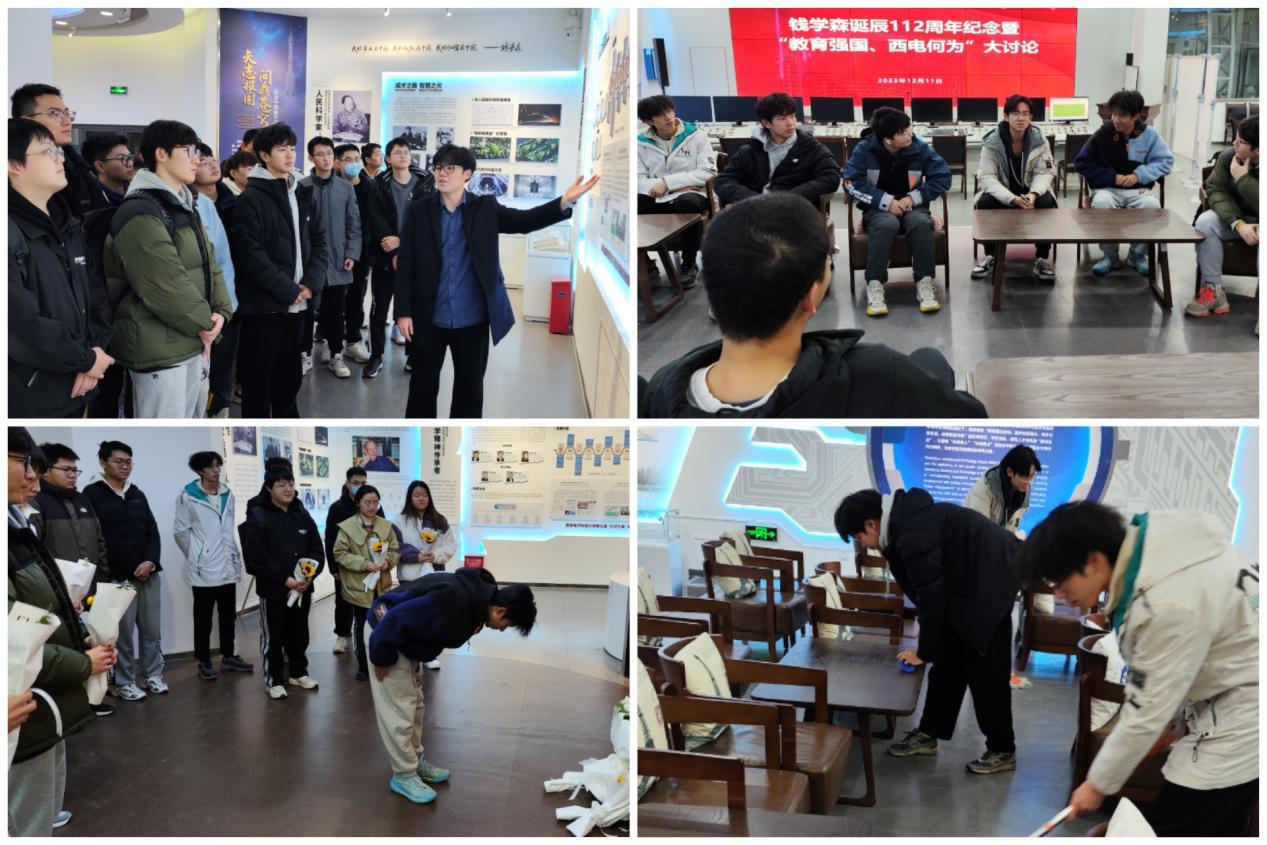 主题讨论前,全体师生怀着无比崇敬的心情,向钱老雕像深深三鞠躬,瞻仰雕像,缅怀致敬。同学们拿起手中的劳动工具,打扫实验室和教育基地,用实际行动践行劳动精神。