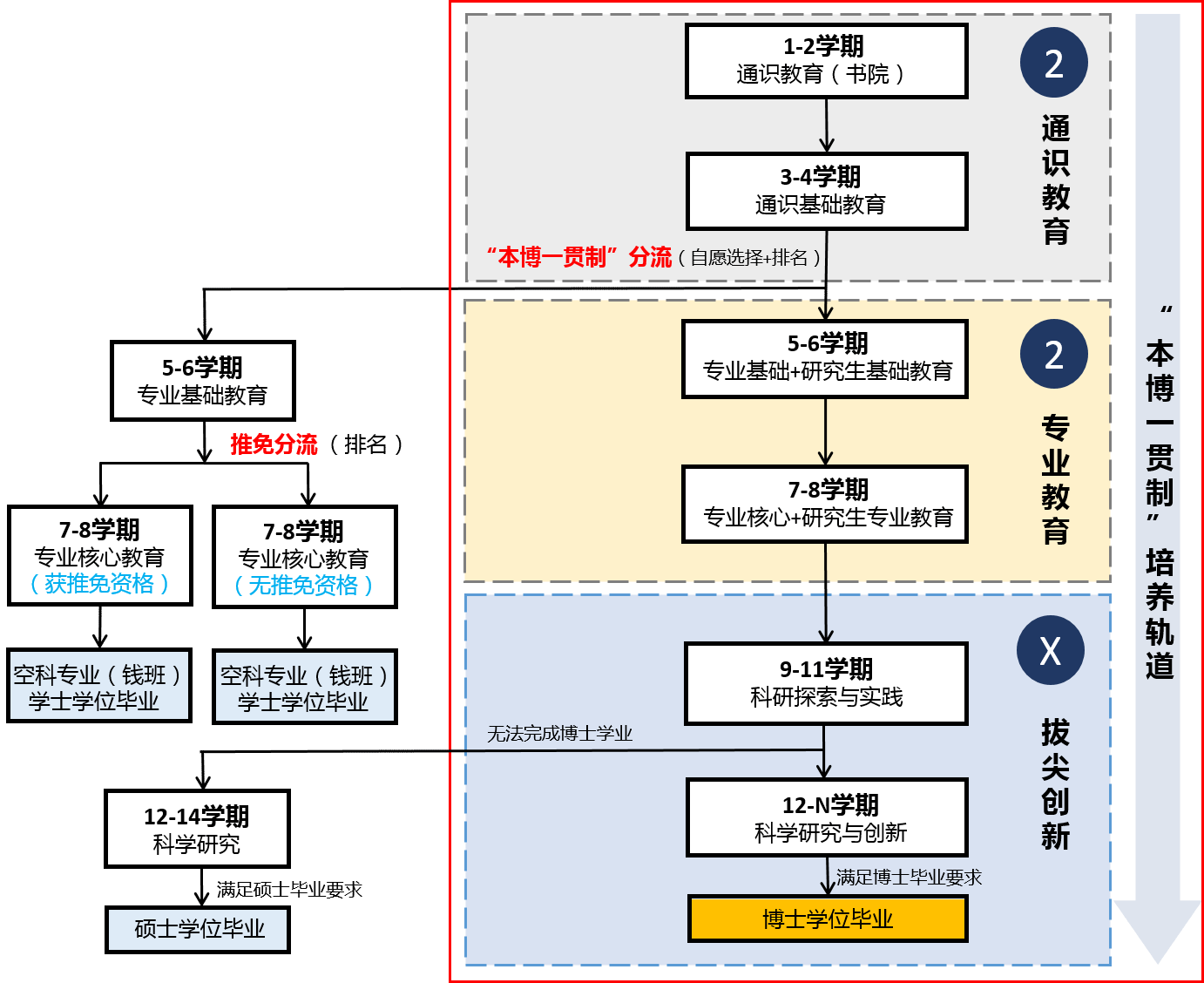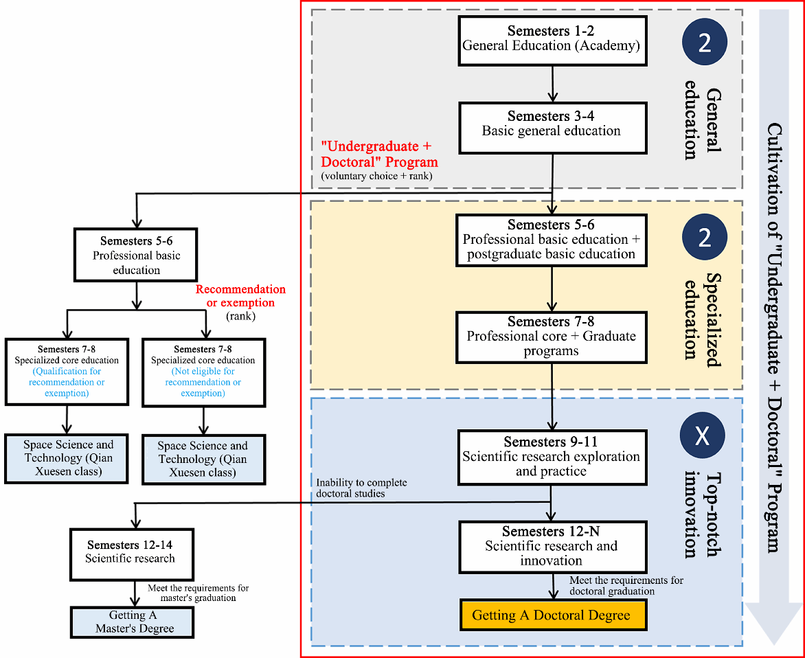 A Qian Xuesen class implements the "2+2+X" academic program, which integrates undergraduate and doctoral studies. Specifically, "2+2" refers to the undergraduate phase of education. The first "2" represents the initial two years of general education, emphasizing the holistic development of students. The second "2" encompasses the final two years of professional education, along with the progression from undergraduate to doctoral studies, focusing on building a strong knowledge foundation for students. "X" refers to the top-notch innovation education designed for doctoral students, lasting a minimum of 3 years and extending up to a maximum of 7 years.
